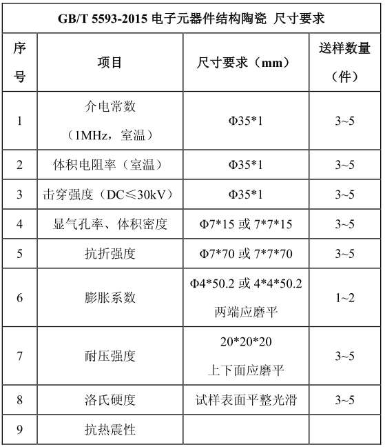GB/T 5593-2015中涉及的電子陶瓷的其他性能指標(biāo),檢測(cè)樣品尺寸做如下匯總: